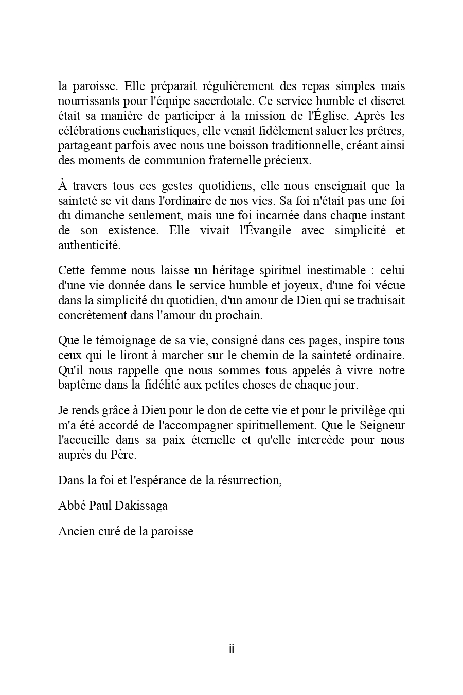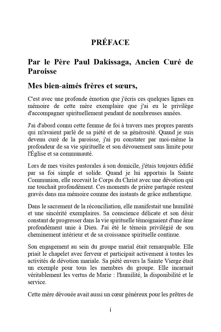 Ce livre est précédé d’une préface inspirante du Père Paul Dakissaga , dont la sagesse pastorale enrichit la portée du texte. Connu pour ses homélies catholiques en ligne , ses prédications chrétiennes quotidiennes et ses articles et commentaires spirituels, le Père Paul Dakissaga saisit la sainteté discrète d’une femme qui a vécu l’Évangile sans jamais le citer.